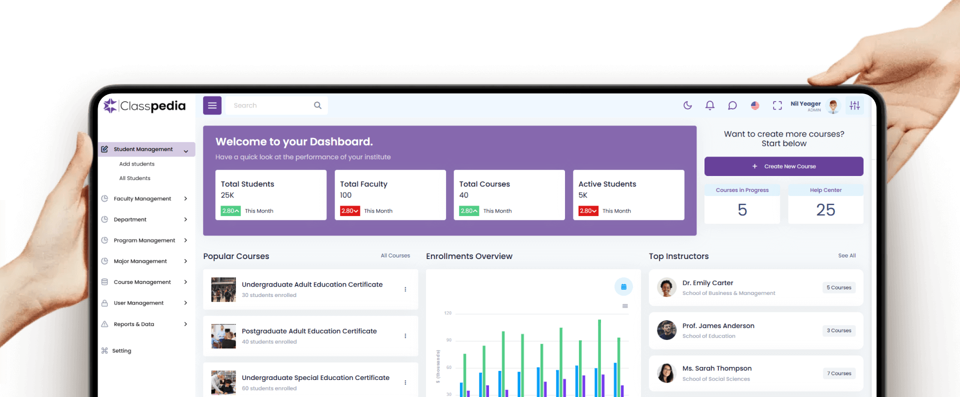 Classpedia helps institutes run smoothly by simplifying operations and making teaching more effective. With an easy-to-use platform that takes just minutes to master, institutes can offer inclusive learning experiences using multimedia content and personalized course paths for every student.